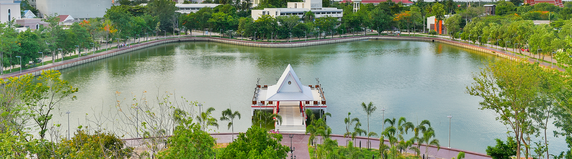 ภาพบรรยากาศโดยรอบของมหาวิทยาลัยราชภัฏนครปฐม แสดงให้เห็นศาลากลางน้ำอันเป็นสัญลักษณ์ของมหาวิทยาลัย ซึ่งตั้งอยู่ใจกลางบึงขนาดใหญ่ รายล้อมด้วยต้นไม้เขียวขจี อาคารเรียน และพื้นที่สีเขียวที่ออกแบบให้กลมกลืนกับธรรมชาติ บ่งบอกถึงความสงบ ร่มรื่น และบรรยากาศที่เหมาะสมกับการเรียนรู้